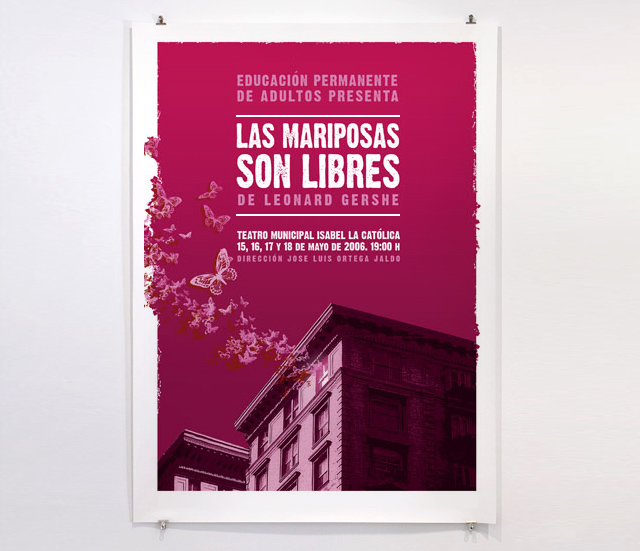 We were asked for the realization of the poster for the play "Butterflies Are Free," performed at the Isabel la Catolica Theatre in Granada.